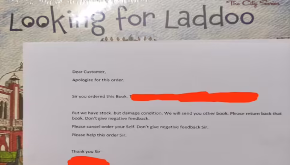 कशिश ने बताया कि उन्होंने अमेजन से एक किताब मंगवाई थी, लेकिन उन्होंने जो किताब चुनी थी, उसके बदले उन्हें बच्चों की किताब 'लुकिंग फॉर लड्डू' भेज दी गई. पैकेट खोलकर वह और भी हैरान रह गया। उसके पास एक नोट था। जिसमें उन्होंने माफी मांगी। नोट में लिखा था, "आपके द्वारा मंगवाई गई पुस्तक हमारे पास थी लेकिन हम उसे नहीं भेज सके क्योंकि वह थोड़ी फटी हुई थी।" आप चाहें तो इस ऑर्डर को वापस कर सकते हैं लेकिन कृपया नकारात्मक टिप्पणी न करें।