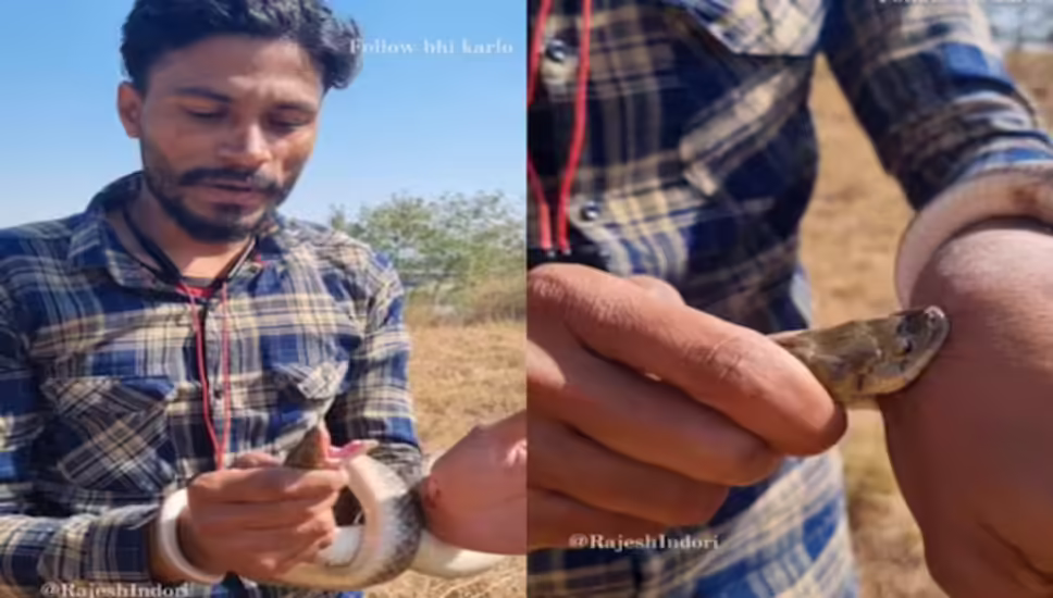 वायरल हो रहे वीडियो में आप देख सकते हैं कि एक शख्स हाथ में सांप को पकड़े हुए है और उसके बारे में कुछ कह रहा है. इसी बीच सांप का मिजाज थोड़ा बदल जाता है और वह काटकर लाइव वीडियो में दिखाता है. आप एक व्यक्ति के हाथ पर सांप को दांत काटते हुए देख सकते हैं। इससे आपको चक्कर आ सकते हैं, लेकिन यह शख्स बड़े आराम से सांप की गर्दन को पकड़कर अपने हाथों से अलग कर देता है। यह बताता है कि बिना जहर वाले सांप के काटने पर भी कैसे बचा जा सकता है।