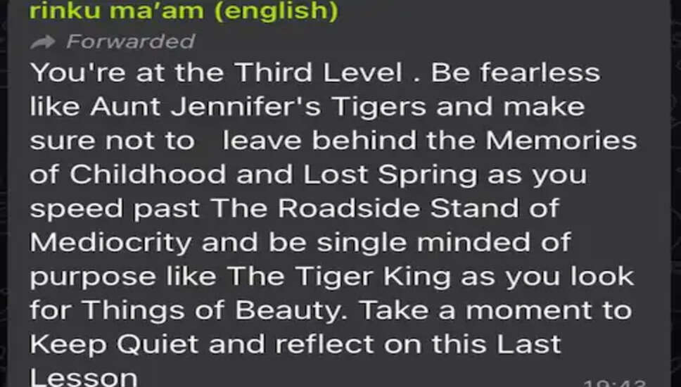 टीचर ने लिखा, तुम तीसरे लेबल पर हो। आंटी जेनिफर के बाघ की तरह निडर बनें और सुनिश्चित करें कि आप बचपन की यादों को पीछे नहीं छोड़ेंगे क्योंकि आप औसत दर्जे के सड़क के किनारे से आगे बढ़ते हैं और टाइगर किंग की तरह उद्देश्य से चलते हैं। साथ ही, शांत होने के लिए कुछ समय निकालें और अंतिम पाठ पर ध्यान केंद्रित करें। यह पोस्ट एक दिन पहले शेयर की गई थी। ट्वीट किए जाने के बाद से इसे 1.3 लाख से ज्यादा बार देखा जा चुका है और यह संख्या लगातार बढ़ती जा रही है। साथ ही, ट्वीट को 2,800 से अधिक लाइक्स मिले