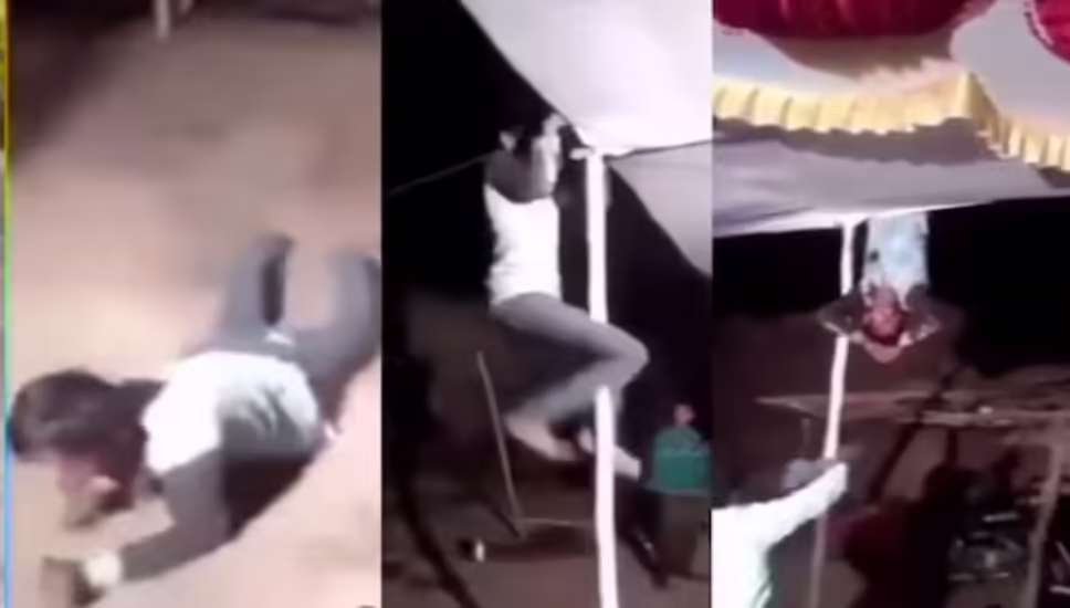 वायरल हो रहे एक वीडियो में आप देख सकते हैं एक शख्स नागिन डांस की धुन पर कमाल की कलाकारी दिखा रहा है. वह सांप की तरह फर्श पर रेंग रहा है, जबकि उसका दोस्त मुंह में रुमाल बांधकर बीन खेलने का नाटक कर रहा है। यह आदमी बीच में लगे टेंट के खंभे पर भी चढ़ जाता है और फिर अपना कमाल दिखाते हुए छतरी के दूसरी तरफ लटक जाता है।