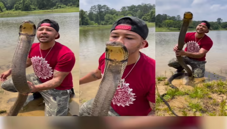 नदी किनारे खड़े किंग कोबरा को लेकर चूमने लगा ये शख्स, देख लोगो के उड़ गए होश