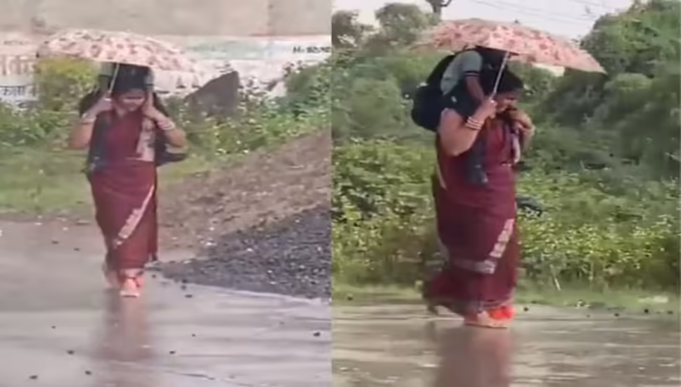 Viral Video: बच्चे को कंधे पर बैठाया, बारिश में नंगे पैर चलती आई नजर!