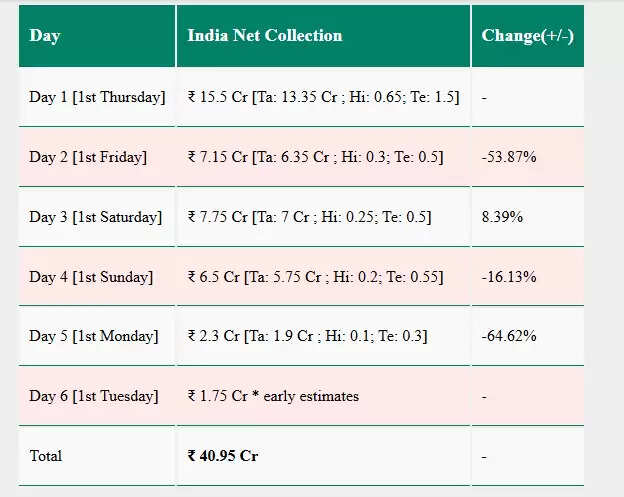 वहीं, कमल हासन की 'ठग लाइफ' की कमाई अभी भी धीमी गति से चल रही है। फिल्म ने छठे दिन 1.75 करोड़ रुपये की कमाई की। इसकी तमिल ऑक्यूपेंसी 17.01% रही। सुबह के शो में 14.72%, दोपहर के शो में 18.79%, शाम के शो में 16.42% और रात के शो में 18.09% ऑक्यूपेंसी रही। अब तक, फिल्म ने कुल 40.95 करोड़ रुपये की कमाई की है, जो कि इसके बजट से कम है।