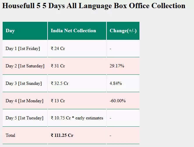 रिपोर्ट के अनुसार, 'हाउसफुल 5' ने अपने पांचवें दिन 10.75 करोड़ रुपये की कमाई की। फिल्म की हिंदी ऑक्यूपेंसी 20.66% रही। सुबह के शो में 9.34%, दोपहर के शो में 20.50%, शाम के शो में 22.65% और रात के शो में 30.14% ऑक्यूपेंसी दर्ज की गई। फिल्म ने 100 करोड़ का आंकड़ा पार करते हुए कुल 111.25 करोड़ रुपये की कमाई की है।