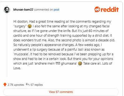 भुवन बाम ने सर्जरी की अफवाहों पर Reddit पोस्ट पर प्रतिक्रिया दी। उन्होंने मजाक में लिखा, 'सर्जरी की बात पढ़कर मजा आ गया। मुझे भी लगता है कि मेरा चेहरा इतना बदल गया है कि ऐसा लग रहा है जैसे मैंने सर्जरी करवाई है। लेकिन यह सब रोजाना एक घंटे की कार्डियो, एक घंटे की स्ट्रेंथ ट्रेनिंग और सख्त डाइट का परिणाम है।'