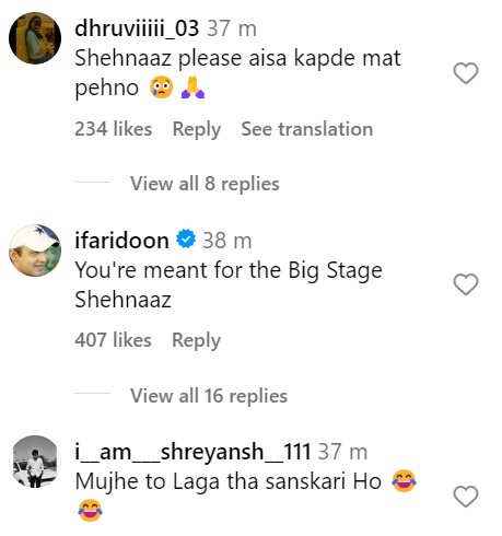 आपके कपड़ों के साथ-साथ आपके संस्कार भी छोटे हो जाते हैं। एक अन्य यूजर ने कहा-शहनाज प्लीज ऐसे कपड़े मत पहनो. एक अन्य यूजर का मानना है कि धीरे-धीरे आपके कपड़े भी सिकुड़ रहे हैं. इस तरह कई लोग शहनाज गिल की आलोचना कर रहे हैं. कुल मिलाकर उन्हें एक्ट्रेस का ये लुक बिल्कुल भी पसंद नहीं आया.