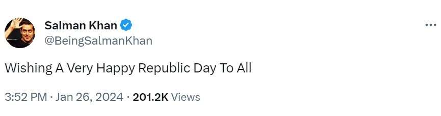 देशभक्ति की मिसाल कायम करने वाले और अपनी टाइगर फ्रेंचाइजी से दर्शकों का मनोरंजन करने वाले सलमान खान गणतंत्र दिवस की बधाई देने में कैसे पीछे रह सकते हैं? देर से ही सही, सलमान ने अपने फैन्स को 75वें गणतंत्र दिवस की शुभकामनाएं दीं। सलमान खान ने शुक्रवार को अपने आधिकारिक एक्स (ट्विटर) हैंडल पर एक ताजा ट्वीट किया है। इस ट्वीट में भाईजान ने लिखा है- आप सभी को गणतंत्र दिवस की शुभकामनाएं. ऐसे में सलमान खान ने अपने फैंस को भारतीय संविधान लागू होने के इस खास दिन की शुभकामनाएं दी हैं. इस ट्वीट पर फैन्स भी कमेंट कर उनके स्वस्थ होने की कामना कर रहे हैं.