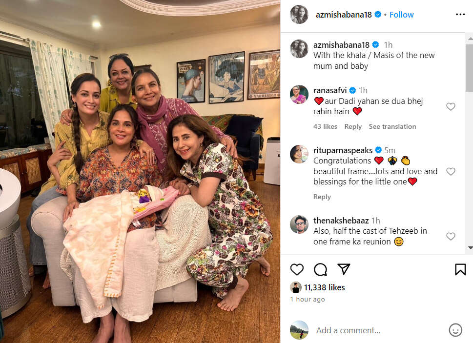 फोटो के कैप्शन में प्रशंसकों सहित अभिनेत्री दीया मिर्जा ने लिखा, "हमारे जीवन के सबसे अच्छे दिनों में से एक।" वहीं, उर्मिला मातोंडकर ने भी कमेंट में अपने दिल की बात कही है. राना सफ़वी ने कमेंट कर लिखा कि दादी यहां से आशीर्वाद भेज रही हैं.