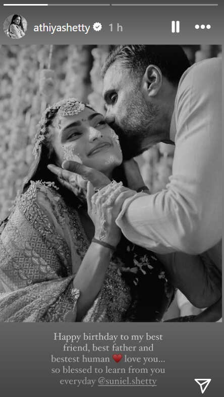 अथिया शेट्टी ने अपने सोशल मीडिया हैंडल इंस्टाग्राम स्टोरी पर पिता सुनील शेट्टी के साथ शादी की तस्वीर शेयर की है, जिसमें एक्टर एक्ट्रेस को किस करते नजर आ रहे हैं। इस फोटो को शेयर करते हुए उन्होंने कैप्शन में लिखा, हैप्पी बर्थडे, मेरे सबसे अच्छे दोस्त, सबसे अच्छे पिता और सबसे अच्छे पिता को जन्मदिन की शुभकामनाएं.