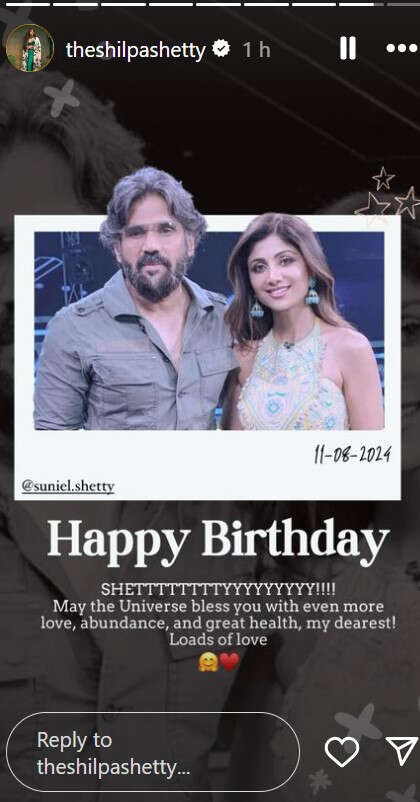 शिल्पा शेट्टी ने अपने सोशल मीडिया हैंडल इंस्टाग्राम स्टोरी पर अभिनेता के साथ एक तस्वीर साझा की। इसे शेयर करते हुए उन्होंने लिखा कि हैप्पी बर्थडे शेट्टी. मेरे प्रिय, ब्रह्मांड तुम्हें अधिक प्यार, प्रचुरता और अच्छा स्वास्थ्य आशीर्वाद दे। ज्यादा प्यार