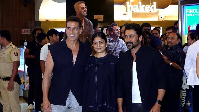दोनों इस फिल्म के सह-निर्माता भी हैं. साथ ही अक्षय की फिल्म में सूर्या ने भी खास भूमिका निभाई है. यह तमिल फिल्म सोरारई पोटरू का आधिकारिक रूपांतरण है, जिसमें सूर्या ने मुख्य भूमिका निभाई थी। ये फिल्म दर्शकों को काफी पसंद आई थी. इवेंट में अभिनेता मैचिंग ट्राउजर के साथ काली शर्ट में नजर आए। उन्होंने अपने लुक को चश्मे और स्मार्टवॉच से पूरा किया। एक्टर की पत्नी ब्लू ब्लेजर में बेहद स्टाइलिश लग रही थीं. वहीं अक्षय कुमार ब्लैक शर्ट और ग्रे जींस में काफी हैंडसम लग रहे थे।