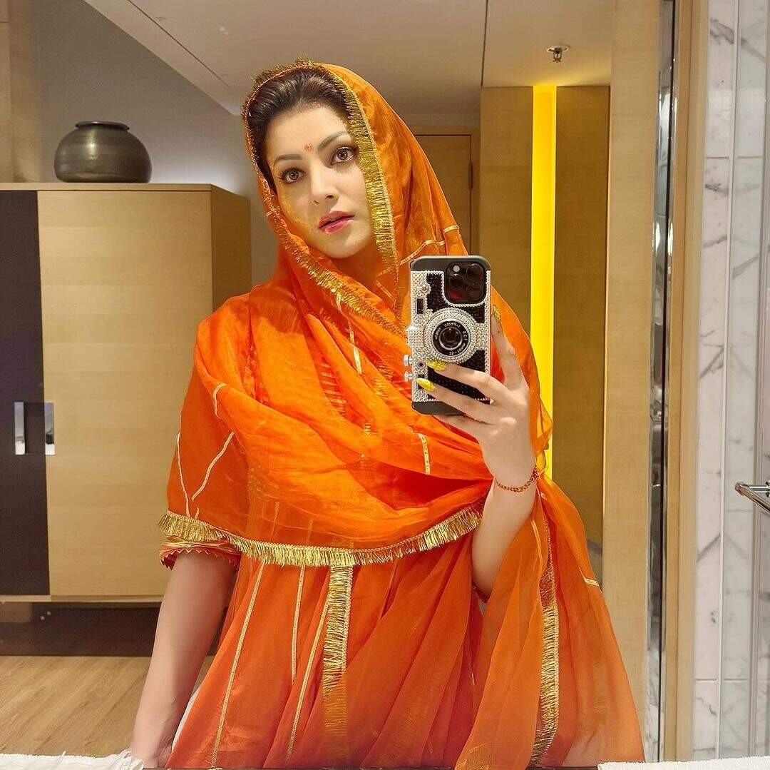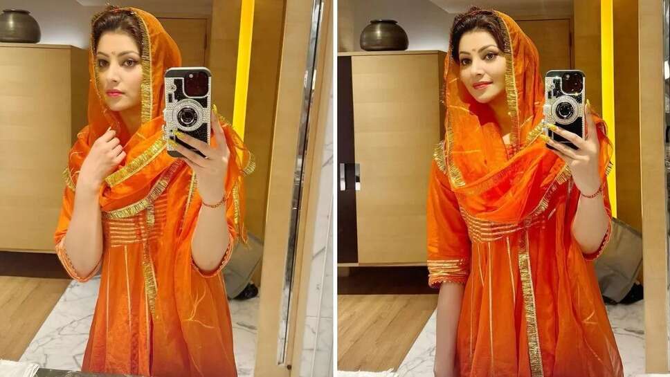 Urvashi Rautela पर चढ़ा भगवा रंग का खुमार , बोल्डनेस की छवि तोड़ देसी लुक में आईं नजर