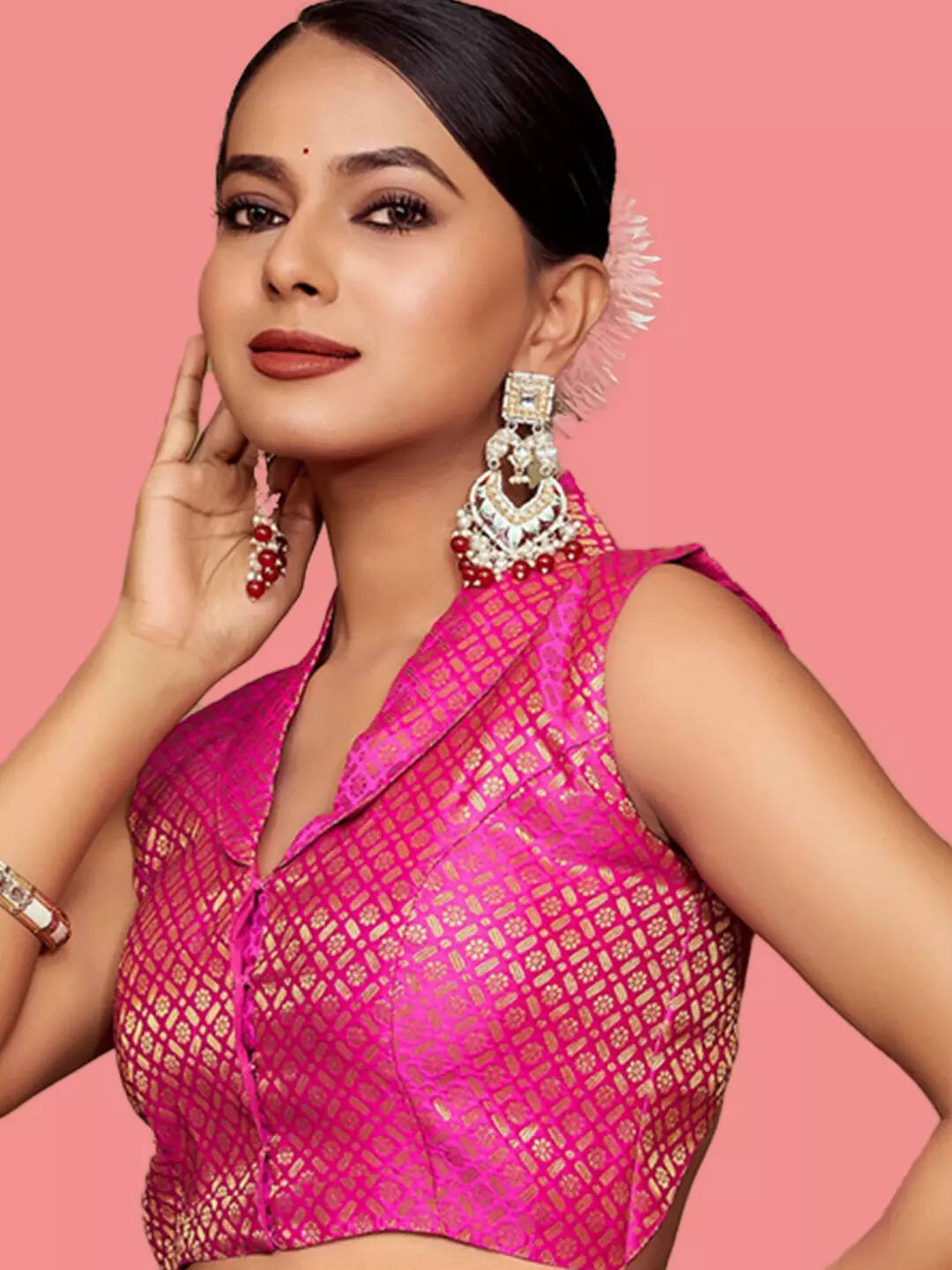 इस डिज़ाइन में एक रॉयल लुक देने वाला गहरा गुलाबी सिल्क बेस और सुनहरा ब्रोकैड वर्क शामिल है। यह बिना बाजू वाला और पैडेड होता है, जो परफेक्ट फिटिंग प्रदान करता है। इसे सुनहरी या बेज रंग की साधारण साड़ी के साथ पहनें, यह त्योहारों के लिए एकदम सही लुक देगा।