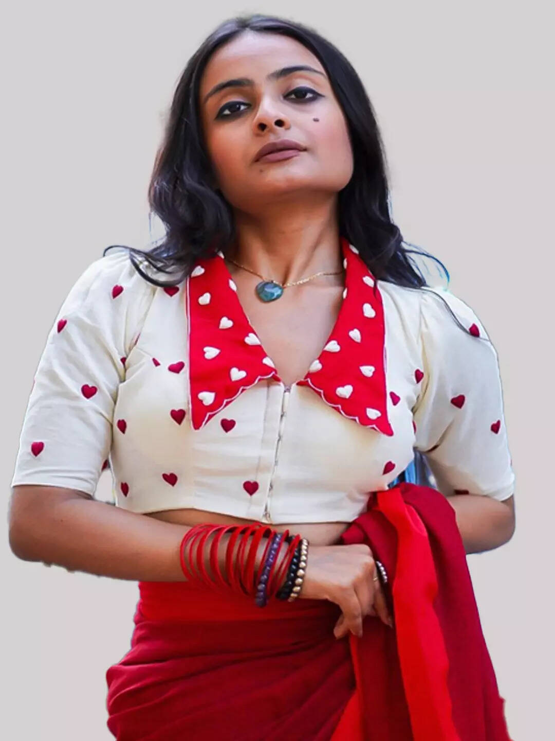सफेद कॉटन बेस पर छोटे-छोटे लाल हार्ट प्रिंट्स के साथ यह ब्लाउज बेहद प्यारा लगता है। इसका लाल कॉलर और सफेद हार्ट डिटेलिंग इसे और भी आकर्षक बनाती है। इसे लाल या हरे कॉटन साड़ी के साथ पहनें। यह दिन में आउटिंग या लंच के लिए एकदम सही है।