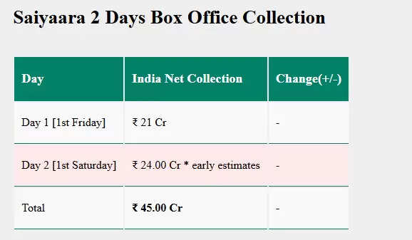 Sacnilk की रिपोर्ट के अनुसार, 'सैयारा' ने दूसरे दिन 24 करोड़ रुपये की शानदार कमाई की। इसकी हिंदी ऑक्यूपेंसी 51.24% रही। सुबह के शो में 28.14%, दोपहर के शो में 50.67%, शाम के शो में 55.40% और रात के शो में 70.74% ऑक्यूपेंसी रही। इस प्रकार, फिल्म ने केवल दो दिनों में 45 करोड़ रुपये की कमाई कर ली है।