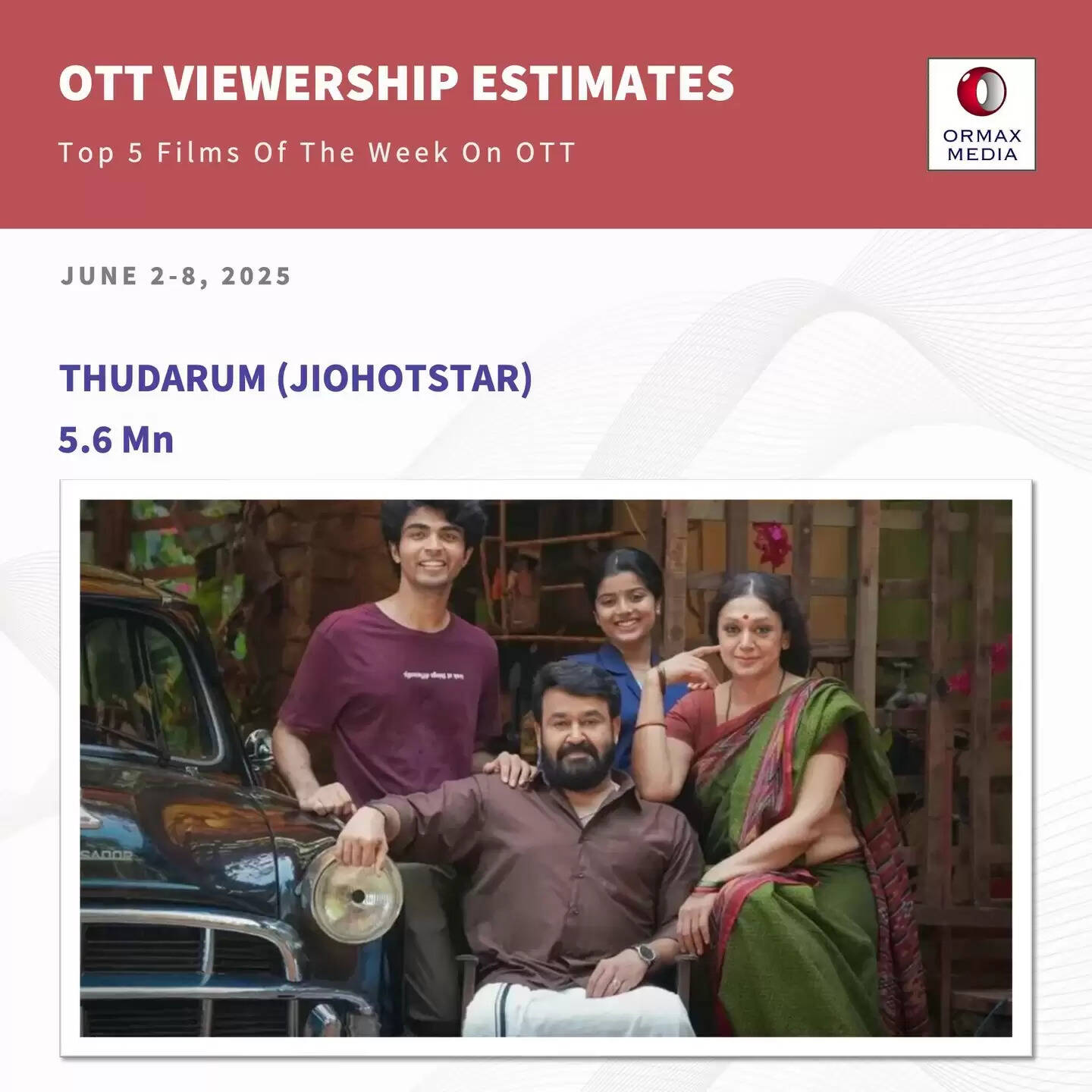 मोहनलाल की फिल्म 'थुडारम' इस सूची में दूसरे स्थान पर है, जो पिछले हफ्ते पहले स्थान पर थी। इस फिल्म की कहानी ने दर्शकों का दिल जीत लिया है। इसमें दिखाया गया है कि एक आम आदमी अपने सौतेले बेटे के कातिलों से कैसे बदला लेता है। इस फिल्म को जियो हॉटस्टार पर 5.6 मिलियन व्यूज मिले हैं।