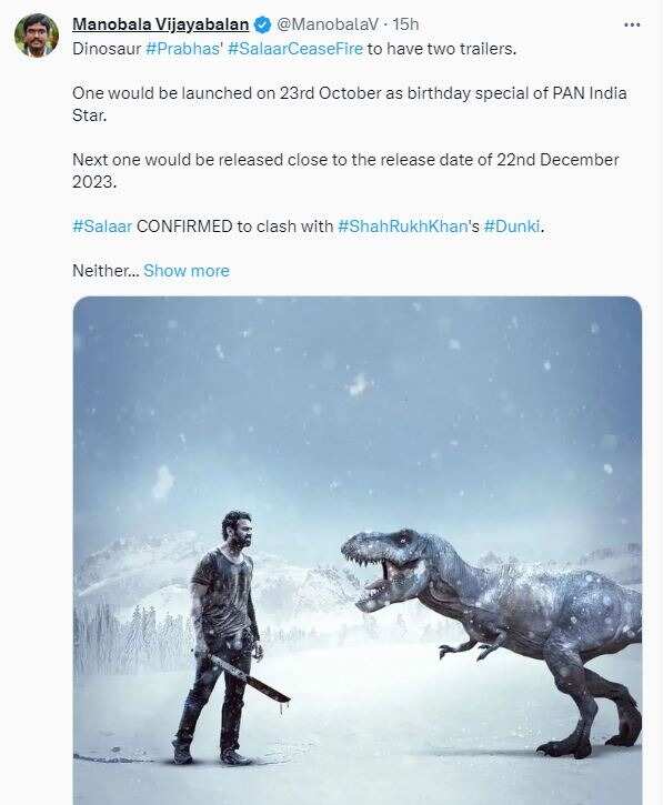 प्रभास की यह फिल्म पहले सितंबर महीने में रिलीज होने वाली थी, लेकिन अब इस फिल्म को दिसंबर तक के लिए पोस्टपोन कर दिया गया है। इसी महीने बाहुबली स्टार 'प्रभास' का जन्मदिन भी है। ऐसे में मेकर्स उनके फैंस को एक बड़ा सरप्राइज देने जा रहे हैं. हाल ही में फिल्म समीक्षक मनोबाला विजय बालन ने अपने ऑफिशियल ट्विटर अकाउंट पर जानकारी शेयर करते हुए बताया कि डायनासोर प्रभास की फिल्म 'सालार' के एक नहीं बल्कि दो अलग-अलग ट्रेलर रिलीज होने वाले हैं. सालार का पहला ट्रेलर 23 अक्टूबर को प्रभास के जन्मदिन के खास मौके पर रिलीज किया जाएगा।