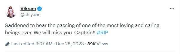 1979 में एक्टर के तौर पर अपना करियर शुरू करने वाले विजयकांत के निधन से उनके फैंस के साथ-साथ साउथ इंडस्ट्री में भी शोक की लहर दौड़ गई है. पोय्यिन सेलवन स्टार चियान विक्रम ने विजयकांत के निधन पर शोक व्यक्त करते हुए लिखा, "सबसे प्यारे और देखभाल करने वाले विजयकांत के निधन से गहरा दुख हुआ। हम आपको बहुत याद करेंगे कैप्टन"।