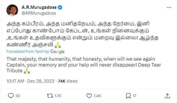 विक्रम के अलावा साउथ सुपरस्टार कमल हासन ने भी अभिनेता के निधन पर शोक व्यक्त किया और लिखा, "मेरे प्यारे भाई विजयकांत के निधन की खबर से गहरा दुख हुआ। एनपीडीए (नेशनल प्रोग्रेसिव द्रविड़ एसोसिएशन) के संस्थापक और तमिल सिनेमा के अद्वितीय अभिनेता। और सभी कैप्टन को।" . बहुत प्यार किया. उनके हर कार्य में मानवता झलकती है.''